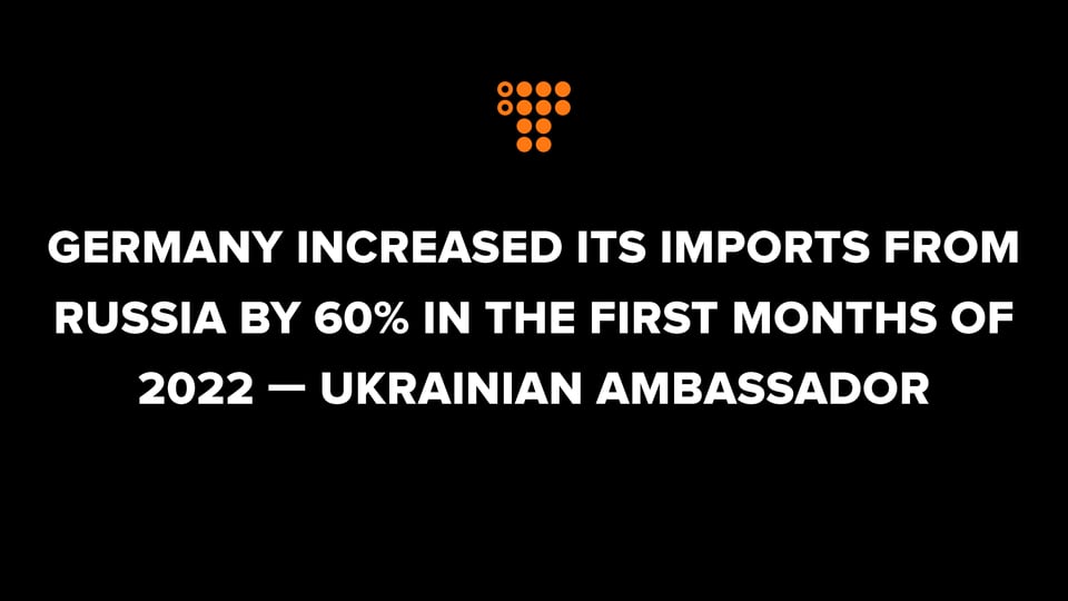 Germany increased imports from Russia by 60% between January and April 2022, transferring a total of approx. €6 billion to the RF, says Ambassador of Ukraine to Germany Andriy Melnyk.