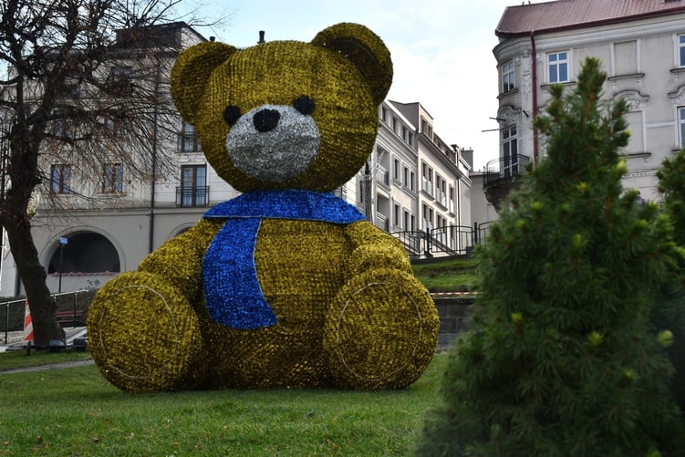 У Перемишлі, що на південному сході Польщі, перед Різдвом установили святкову інсталяцію у вигляді золотого ведмедя із синім шарфом. Проте така колірна гама викликала бурхливе обговорення в соціальних мережах через асоціацію з Україною. Зрештою, місту довелося замінити фрагмент прикраси.