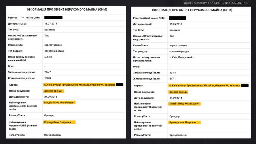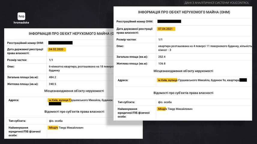14 листопада, за даними hromadske, НАБУ наклало арешт на дві квартири на Грушевського 9-А, які перебувають у власності Міндіча. І ще на одну орендовану ним квартиру в тому самому будинку.