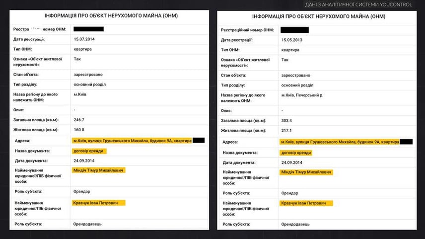 За даними hromadske, у співвласника компанії студія «95 квартал» Тимура Міндіча — чотири квартири на Грушевського 9-А. Дві з них Міндіч орендував у Івана Кравчука — тестя колишнього народного депутата Антона Яценка.