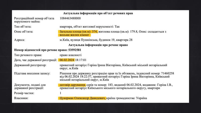 Обидві квартири Олександру подарувала дружина Олена: одну, площею 80 м², — у 2023 році, іншу, площею 374 м², — у 2024-му.