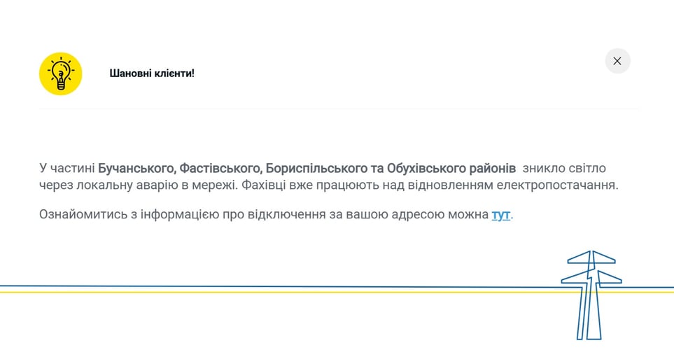ДТЕК у Київській області повідомив про перебої зі світлом у кількох районах.