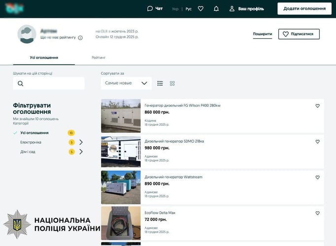 Поліціянти встановили, що це був не поодинокий випадок. Цей продавець нібито масово публікував оголошення про продаж генераторів, будівельних вагончиків, інструментів та іншого обладнання на популярних онлайн-платформах за «привабливою» ціною.