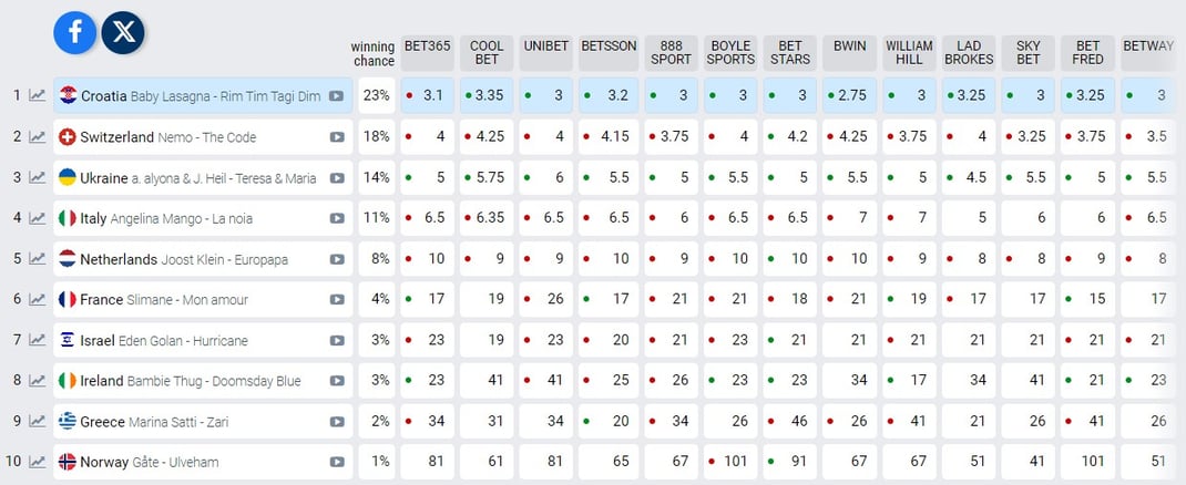 Ще вчора Україна перебувала на 5 місці в списку з 8% шансів на перемогу. Тепер імовірність перемоги України становить 14%. Попереду лише Швейцарія з 18% та Хорватія із 23% імовірності на перемогу.