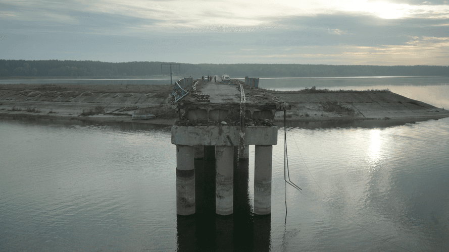Наша фінальна сцена фільму: підірваний міст у місті Старий Салтів на Харківщині. Це місце я побачила з новин: уже після контрнаступу з'явилися кадри, коли «Нова пошта» човном перевозила посилки з одного берега на інший. Це було дуже зворушливо. Фактично в такий спосіб я побачила ці — тоді здавалося — історичні кадри в новинах.Оксана Карпович, режисерка документального фільму «Мирні люди»