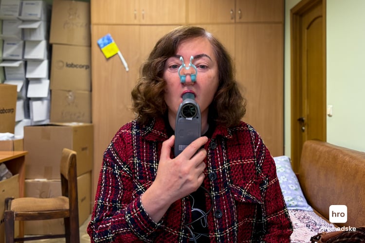 У наступному кабінеті мені стає смішно. Дуже смішно, бо в мене на носі пластикова прищіпка, яка перекриває дихання. Але сміятися не можна — прищіпка злетить, а вона для дослідження мусить міцно стискати крила носа. У руках я тримаю прилад, який називається спірометр — така собі бамбулька з трубкою для визначення функцій дихальної системи. Маю щільно обхопити губами ту трубку й дихати ротом. Глибокий спокійний вдих — різкий видих. Потім спокійний глибокий вдих — спокійний довгий видих. Потім — немов біжу на гору: частий глибокий вдих і частий видих.
