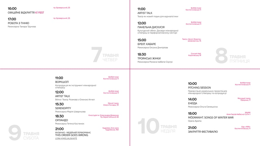 Фестиваль триватиме із 7 до 10 травня на восьми локаціях: від «МЦКМ» та «Малого театру», «Театру на Лівому березі», «Молодого театру», театру «Золоті ворота», до Concert Hall на Кирилівській, 41, Кіностудії Довженка та готелю Bursa.