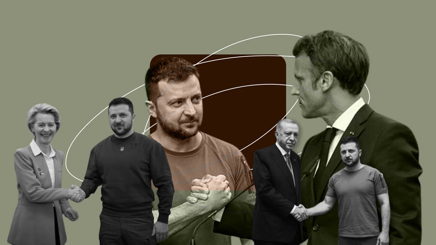 Натомість Володимир Зеленський не зрадив стилю мілітарі й одягнув футболку, штани та кросівки кольору хакі. На колективному портреті п'яти європейських лідерів у Києві український президент знову вирізнявся, підкреслюючи своїм виглядом, що російська агресія далека від завершення і український спротив триває.