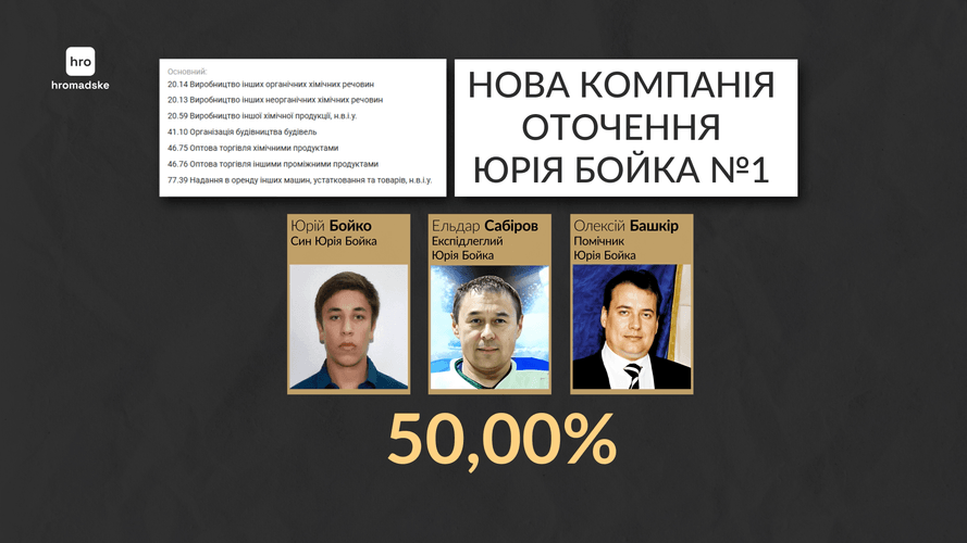 У липні 2024-го, менше як рік тому, Юрій Бойко — син Юрія Бойка, отримав 24,5% у компанії, яка спеціалізується на виробництві хімічних речовин. Назвемо її із міркувань безпеки Компанією № 1. По суті, вона спеціалізується тому самому, чим до повномасштабного вторгнення займалася «Зоря» — містоутворювальне хімічне підприємство нині окупованого Рубіжного, що на Луганщині.