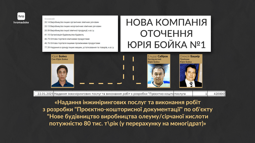 Ця Компанія № 1, яка частково належить синові Бойка, а частково його оточенню, у 2025 році замовила проєктну документацію майбутнього виробництва олеуму й сірчаної кислоти, але вже потужністю 80 тисяч тонн на рік замість 40, як хотіли раніше.