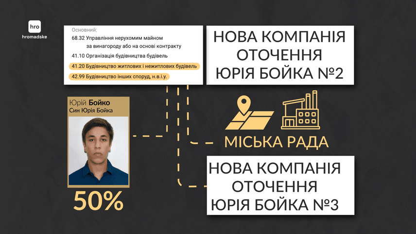 Землю цій компанії Юрія Бойка-молодшого надала в оренду міська рада — всього близько 20 гектарів. Будівлі на цій території компанія викупила нібито за майже 10 млн гривень. А саму землю передала в суборенду іншій компанії — та вона також виявилася пов’язаною з Бойком-старшим.