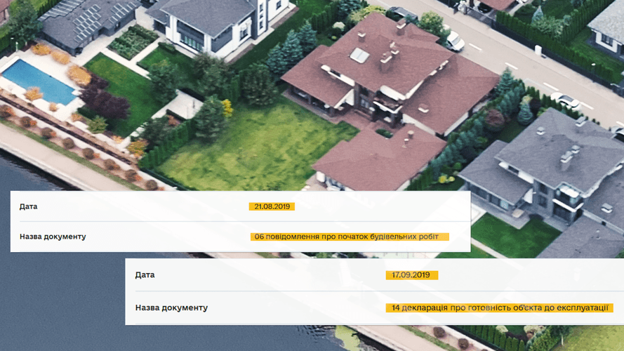 Але за документами Юрій Дьомін будинок не купував, а нібито у травні 2019-го придбав лише земельну ділянку — офіційно за майже 153 тисячі гривень. А потім на ділянці розпочалося будівництво маєтку за проєктом «Френк». Його збудували ніби-то всього за місяць — з серпня по вересень 2019 року.