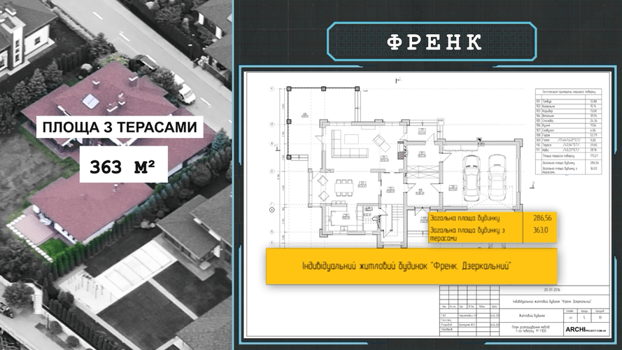 Проєкт такого котеджу, яким володіє Юрій Дьомін, у цьому містечку має назву «Френк». Відповідно до проєктів таких котеджів, разом із терасами загальна площа сягає не 286, а цілих 363 м².