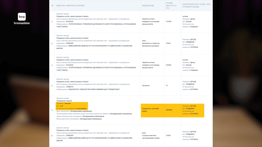 Не надто прибутковий бізнес і мільйонні борги в минулому не завадили батьку Людмили протягом 2021-2022 років подарувати дочці 6 000 000 гривень, а минулого року купити собі VOLKSWAGEN TOUAREG 2023 року випуску. Пояснювати ці фінансові успіхи журналістам чоловік відмовився.