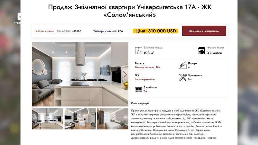 А ось оголошення про продаж ділянки в цьому районі у 2017 році. Відповідно до нього, 15 соток обійшлися б тоді майже у 400 000 гривень, або 14 500 доларів. 978 доларів за сотку. Тобто у 12 разів дорожче… І це порівняння не з ринковими цінами, а з аукціоном з мінімальною стартовою ціною.
