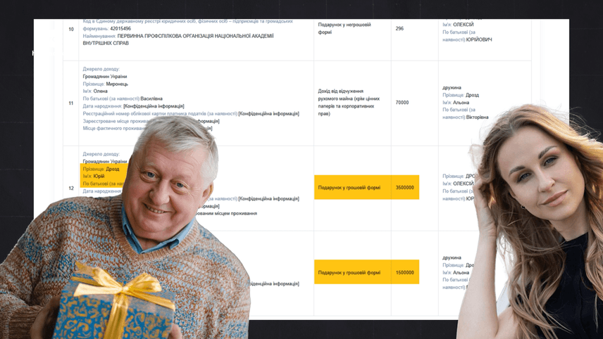 Якісь значні доходи родина Олексія отримала тільки у 2021 році, коли його батько подарував йому 3 500 000 гривень. Півтора мільйона Дрозд передарував дружині Альоні. Але навіть ці гроші мало що пояснюють.