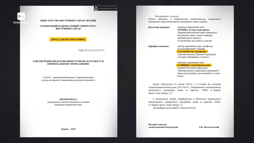 Наступного року після звільнення жінка захистила дисертацію в Харківському національному університеті внутрішніх справ. За збігом обставин її опонентом був Олег Татаров. А ще Сергій Олійник, тодішній посадовець ДБР, і нинішній колега її чоловіка — заступник керівника БЕБ у Київській області.
