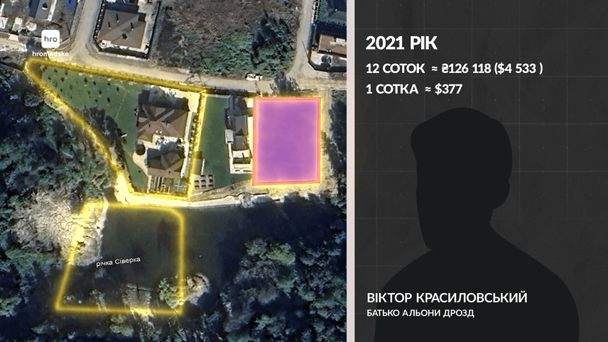 Спочатку Олексій Дрозд купив земельну ділянку біля Віти-Поштової. 24 сотки землі йому пощастило придбати за 49 595 гривень — менш як 2000 доларів на той час. Або 76 доларів за сотку.