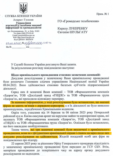 У Службі безпеки hromadske відповіли, що жодних зв’язків у групи компаній «Здоров’я» з росією не бачать: «За наявною інформацією, під час розслідування було встановлено, що вказані фірми не мають зв’язків із державою агресором. Всі три зазначені компанії були виключені з кримінального провадження, вони не є фігурантами кримінальної справи й станом на зараз досудове розслідування щодо них не здійснюється».