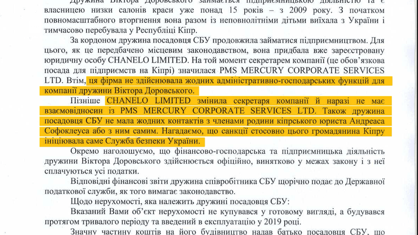 Після того як hromadske звернулося із питаннями до СБУ щодо зв’язків родини генерала Доровського з родиною Софоклеусів нам відповіли: «Ця фірма не здійснювала жодних адміністративно-господарських функцій для компанії дружини Віктора Доровського. (…) CHANELO LIMITED змінила секретаря компанії і наразі не має відносин із PMS MERCURY CORPORATE SERVICES LTD».