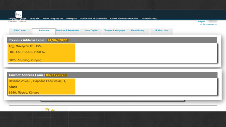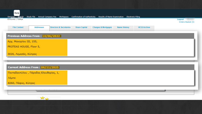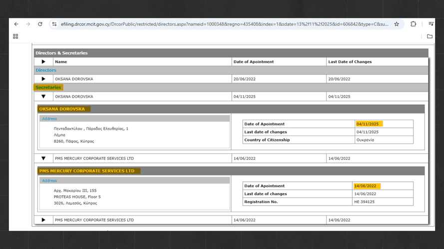 Так само Оксана Доровська змінила і юридичну адресу своєї фірми — до звернення hromadske вона збігалася з адресою компаній Софоклеусів, таких як: Andreas M. Sofocleous & Co LLC та PMS MERCURY CORPORATE SERVICES.
