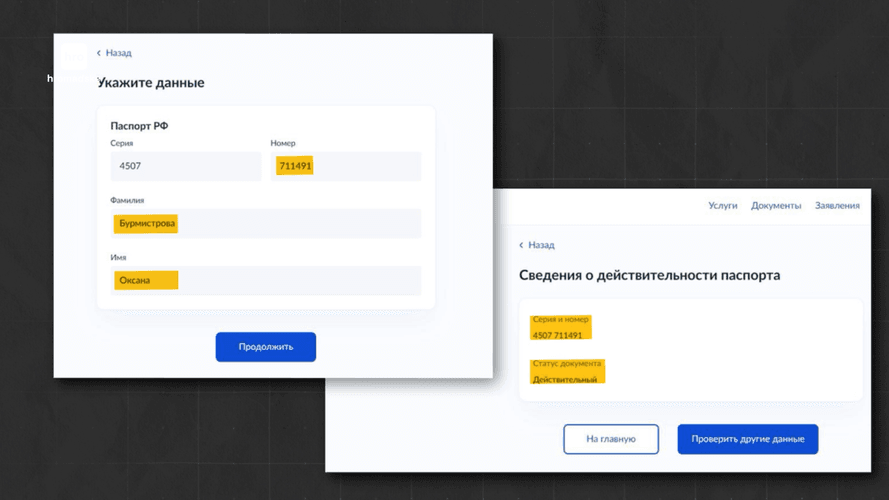 Один із паспортів пані Оксани досі дійсний — про це свідчить інформація з російського єдиного державного порталу «Госуслуги».