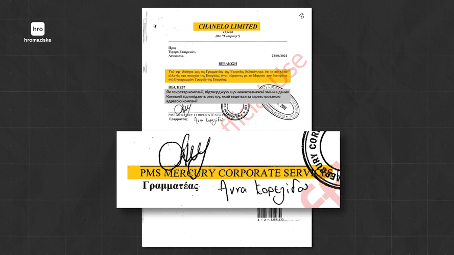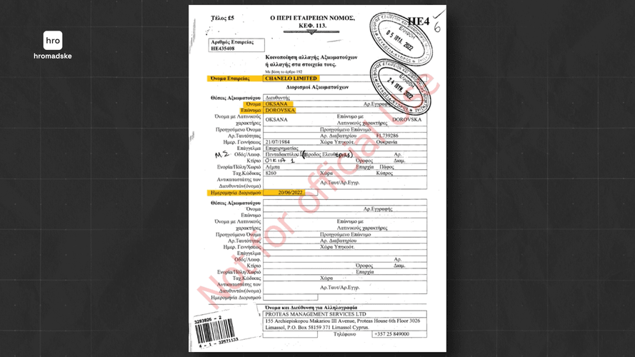 Відповідно до виписки з кіпрського реєстру юридичних осіб, у червні 2022 року жінка придбала на острові фірму під назвою CHANELO LIMITED.
