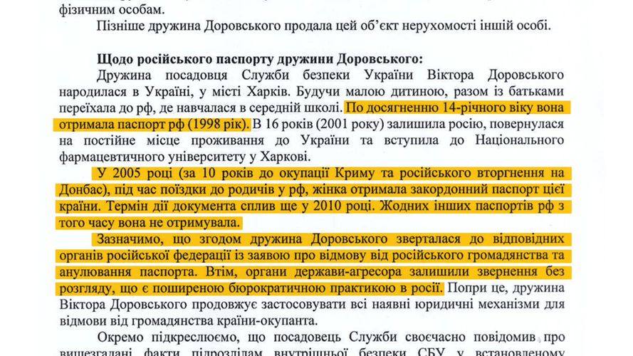 В СБУ підтвердили тільки наявність паспорта громадянки рф, який Оксана Доровська отримала у 14 років, і розповіли про ще один — закордонний, отриманий пізніше, у 2005-му. Його терміни вже спливли.