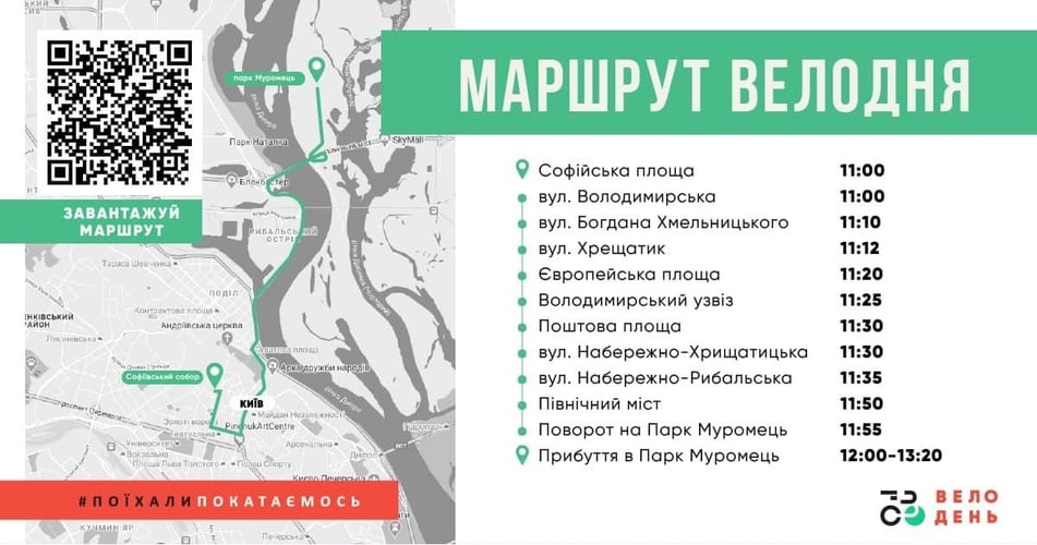 «Велодень» почнеться на Софійській площі о 10:00 з традиційного групового фото, а колона має рушити об 11:00. Протягом 12:00 — 13:20 учасники «Велодня» мають дістатися парку «Муромець», де велофестиваль і продовжиться до 20:00.