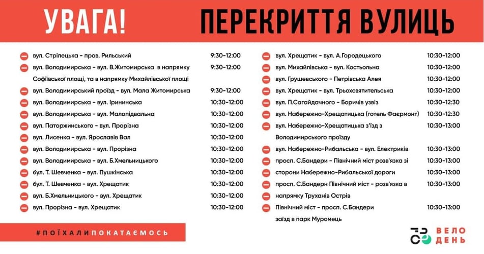 Як раніше повідомляли в Київській міській державній адміністрації, з 09:00 протягом «Велодня» у місті обмежать рух центральними вулицями міста за маршрутом параду. Організатори оприлюднили їх повний перелік: