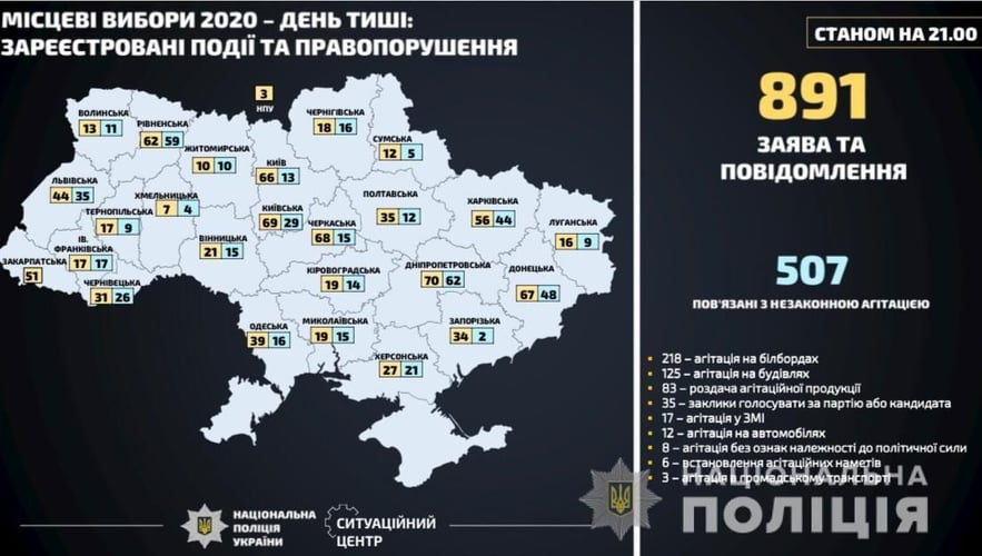 У «день тиші» перед виборами 24 жовтня, коли політична агітація заборонена, поліцейські станом на 21:00 зафіксували 891 заяву та повідомлення щодо порушень. У 29 випадках правоохоронці порушили кримінальні провадження. Також поліцейські склали 109 протоколів про вчинення адміністративних правопорушень виборчого законодавства.