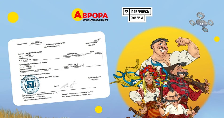 У мережі мультимаркетів «Аврора» з вересня до листопада тривала благодійна акція, метою якої було зібрати 3 млн гривень на закупівлю дронів для ЗСУ. Врешті клієнти мультимаркету зібрали 3 481 576 грн, а «Аврора» подвоїла цю суму. Гроші перерахували до фонду «Повернись живим».
