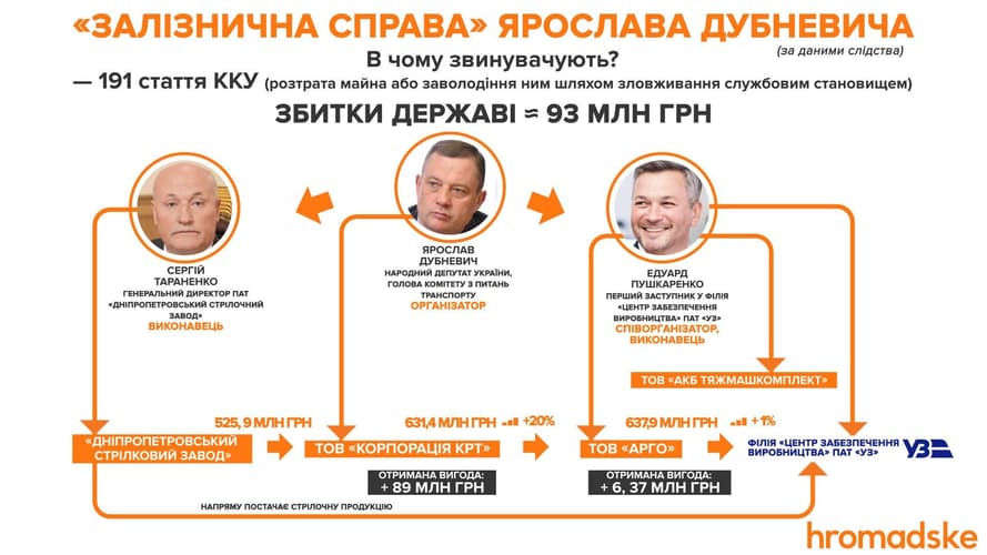 - За даними слідства, Ярослав Дубневич впродовж 2015-2017 років, будучи народним депутатом 8-го скликання та головою транспортного комітету, сприяв тому, щоб «Укрзалізниця» виділила понад 500 мільйонів на закупівлю стрілочної продукції. До цього процесу, за даними слідства, він залучив пов’язане із собою підприємство «Дніпровський стрілочний завод» та завів компанії-посередники: свою ТОВ «Корпорація КРТ» та компанію контрольовану помічником Едуардом Пушкаренком ТОВ «Арго». Вони, запевняють слідчі, завищили ціну на продукцію, чим спричинили збитки державі у розмірі понад 93 мільйони гривень. У разі доведення вини, йому загрожує від 7 до 12 років позбавлення волі.