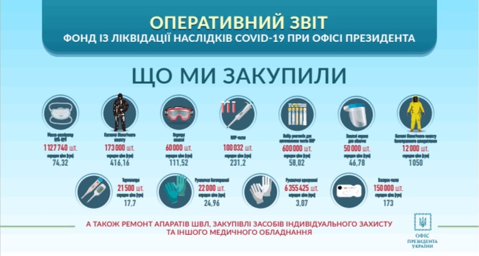 Зі створеного Офісом президента фонду ліквідації наслідків COVID—19 витратили вже 374,62 мільйона гривень. За ці кошти купували переважно засоби індивідуального захисту.