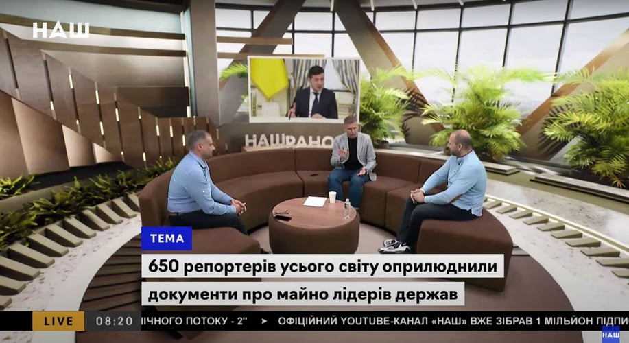 Проросійський телеканал «НАШ» почав обговорювати розслідування Pandora Papers із самого ранку. Так, ранковий етер назвали «Офшори "антиолігархічного президента" Зеленського».