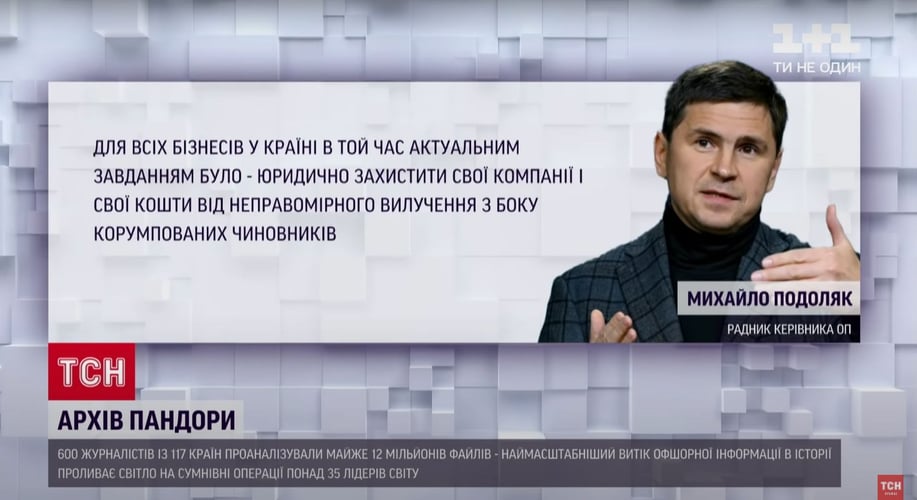 Про Зеленського розповіли лише те, що він із оточенням створив мережу офшорних компаній у 2012-му, а перед першим туром президентських виборів передав свою частку Сергію Шефіру. Також навели коментар радника керівника Офісу президента Михайла Подоляка, який зауважив, що офшори відкривалися з метою захисту від корумпованих чиновників.