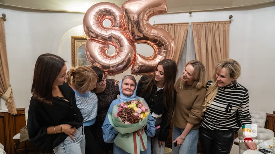 У дальній кімнаті за довгим столом про щось голосно розмовляє і сміється молодь. По центру сидить пані Галина. За її спиною — великі кулі із цифрами «8» і «5». Вона вдягнена в просту вечірню сукню і фіолетову хустку.