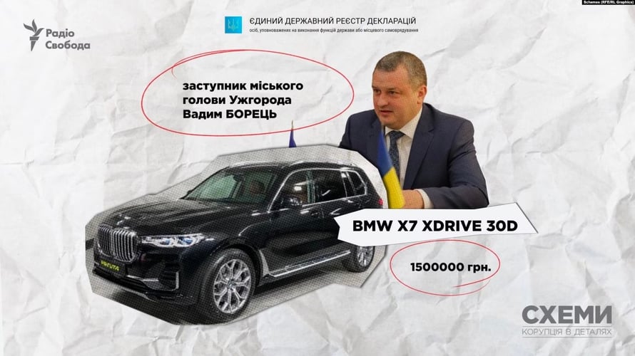 Заступник міського голови Ужгорода Вадим Борець наприкінці 2022-го вказав, що став власником BMW X7 XDRIVE 30D 2022 року випуску за 1,5 млн грн.