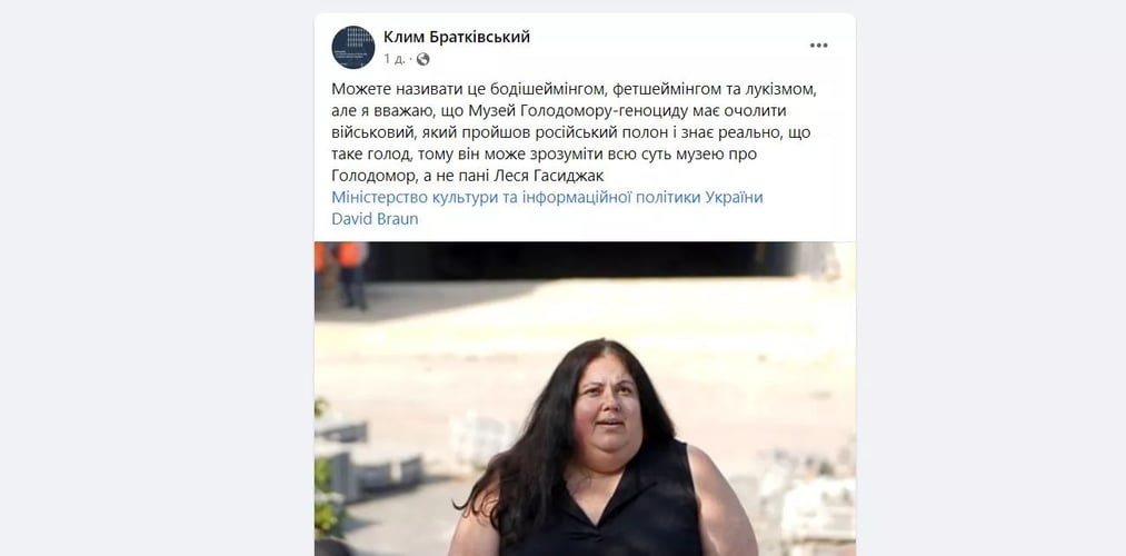 Юрист Клим Братківський у Facebook заявив, що Леся Гасиджак не може очолювати Музей Голодомору-геноциду через нібито невідповідну зовнішність, а натомість керівником має бути «військовий, який пройшов російський полон і знає реально, що таке голод».