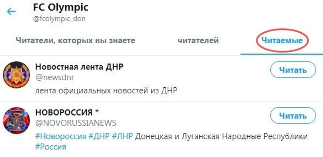 Акаунт у Twitter донецького футбольного клубу «Олімпік», який виступає в чемпіонаті України, був підписаний на «Новоросію», стрічку новин так званої «ДНР» та ставив лайки публікаціям російського пропагандистського ЗМІ.