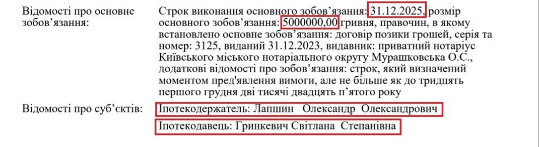 Через день після арешту чоловіка, 31 грудня минулого року, Світлана Гринкевич узяла кредит на 5 мільйонів гривень у такого собі Олександра Лапшина. А вже 2 січня вона наклала через цей кредит обтяження на обидві квартири у нотаріуса. В реєстрі нині це значиться як договір іпотеки.