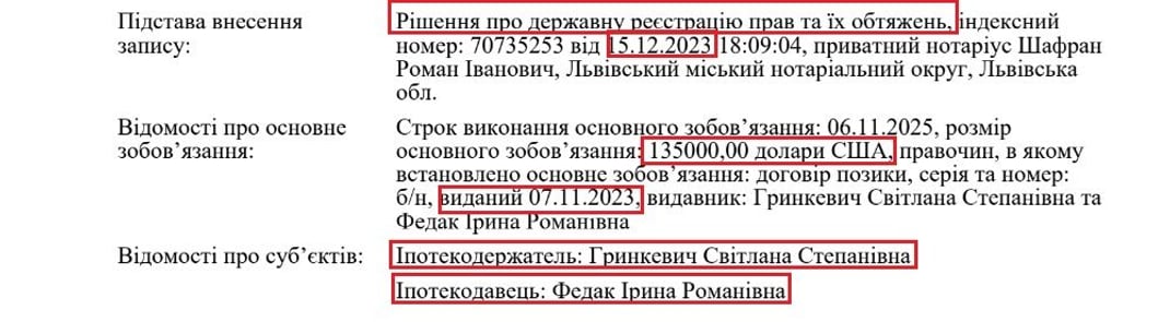 Того самого дня, 15 грудня 2023 року, Світлана Гринкевич та Ірина Федак оформили у нотаріуса ще один договір позики, тепер уже на люксові апартаменти у Львові під 130 квадратів. Вони були придбані в листопаді 2023 року. Така нерухомість коштувала щонайменше 7 мільйонів гривень.