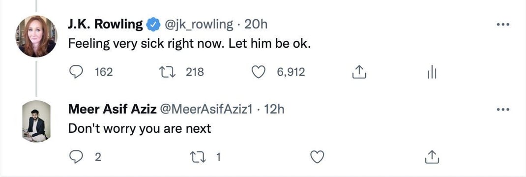 Ці погрози надійшли письменниці після того, як вона підтримала письменника Салмана Рушді — він кілька днів тому пережив замах на вбивство. Роулінг засудила напад та написала, що сподівається на швидке одужання постраждалого.