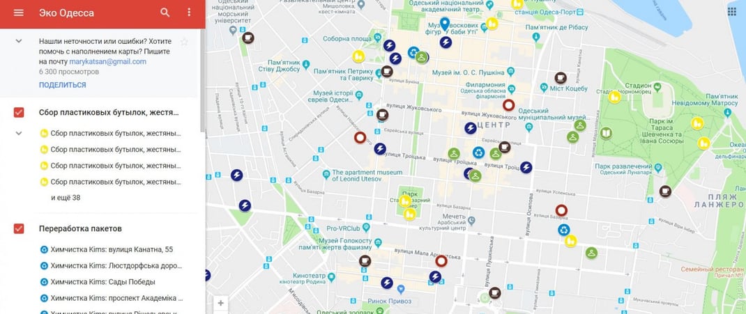 Мешканка Одеси Марія Кацан нанесла на Google—карту усі точки прийому пластику, батарейок та пластмасових кришечок.