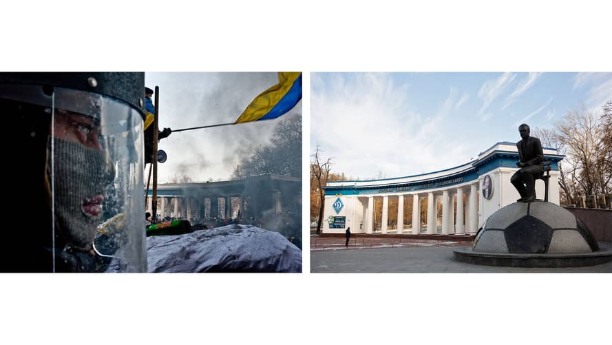ЛІВОРУЧ: Учасник акції протесту в захисному шоломі, вулиця Грушевського, Київ, 25 січня 2014 року. ПРАВОРУЧ: Вхід на стадіон «Динамо» та пам'ятник українському футболісту й тренеру Валерієві Лобановському, Київ, 18 листопада 2018 рокуЄвген Малолєтка/УНІАН; Анастасія Власова/Громадське