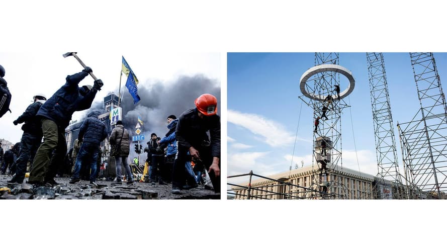 ЛІВОРУЧ: Мітингувальники розбивають бруківку на дрібніші шматки на Майдані Незалежності в Києві, вранці в середу, 19 лютого 2014 року. Напередодні ввечері 18 лютого силовики штурмували Майдан з усіх боків, прорвали блокаду на Хрещатику та Інститутській. Для спецоперації залучили декілька частин внутрішніх військ МВС, штурмові спецпідрозділи СБУ та МВС — «Альфа», «Омега», роту спецпризначення ПМОП «Беркут», три БТР, щонайменше три водомети, сотні «тітушок» та комунальників. Згорів Будинок профспілок на Майдані. ПРАВОРУЧ: Інженери встановлюють конструкцію на Майдані Незалежності для заходів до 5-ї річниці початку Євромайдану, Київ, 18 листопада 2018 року. На задньому плані — відновлений і відкритий у жовтні 2018 року Будинок профспілокЄвген Малолєтка/УНІАН; Анастасія Власова/Громадське