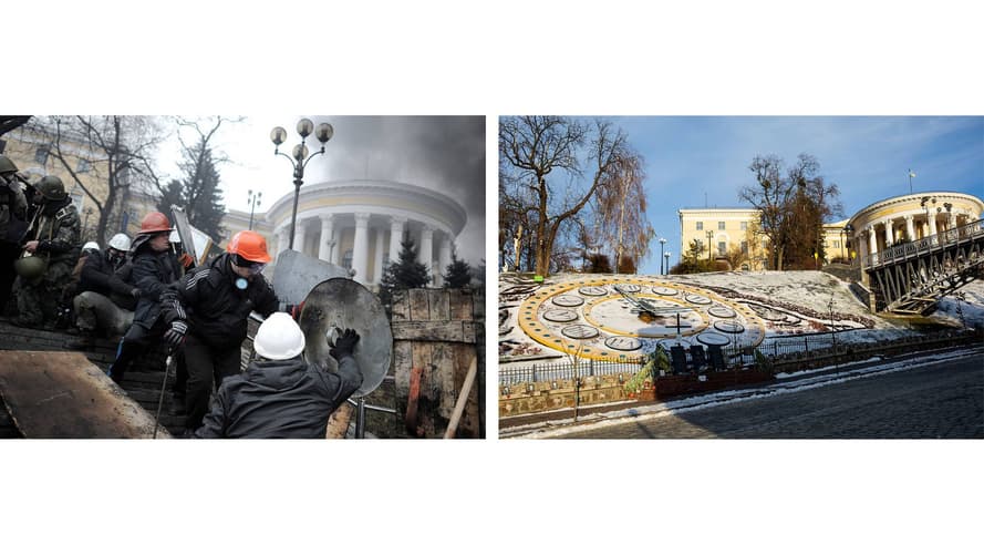 ЛІВОРУЧ: Протестувальники намагаються прорватися вгору вулицею Інститутською, коли правоохоронці відійшли від позицій зранку 20 лютого 2014 року. ПРАВОРУЧ: Вид на Жовтневий палац та оновлений квітковий годинник на вулиці Інститутській, Київ, 18 листопада 2018 рокуEPA/ALEXEY FURMAN; Анастасія Власова/Громадське