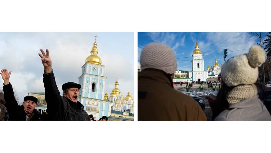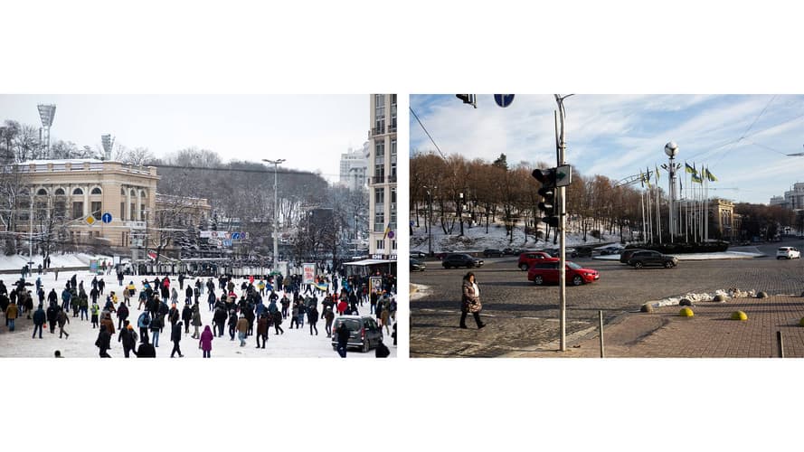 ЛІВОРУЧ: Недільне віче на Майдані Незалежності в Києві, 2 лютого 2014 року. ПРАВОРУЧ: Перехожі на Майдані Незалежності в Києві в неділю, 18 листопада 2018 рокуЄвген Малолєтка/УНІАН; Анастасія Власова/Громадське
