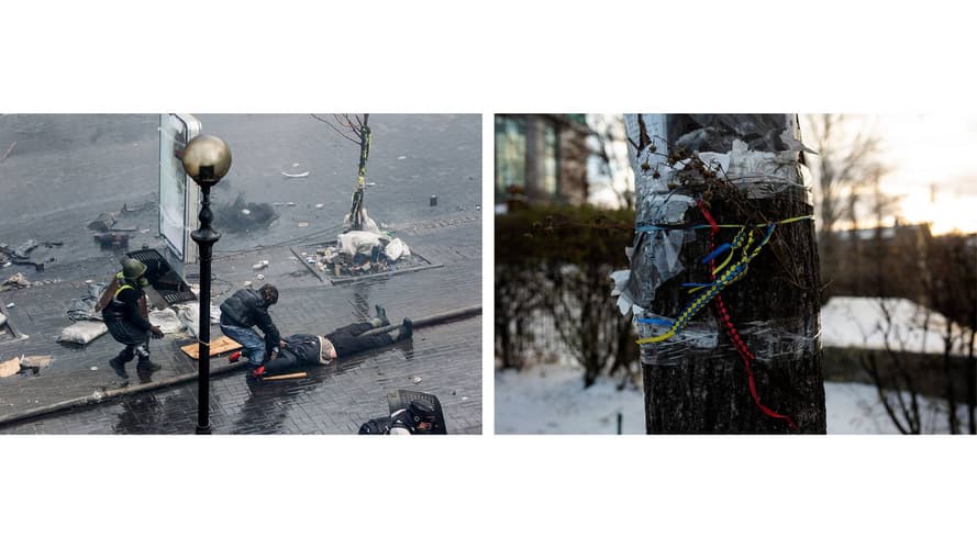 ЛІВОРУЧ: Протестувальники відтягують пораненого товариша на вулиці Інститутській, Київ, 20 лютого 2014 року. ПРАВОРУЧ: Стрічки та квіти на дереві на вулиці Героїв Небесної сотні (частина вулиці Інститутської), Київ, 18 листопада 2018 рокуЄвген Малолєтка/УНІАН; Анастасія Власова/Громадське