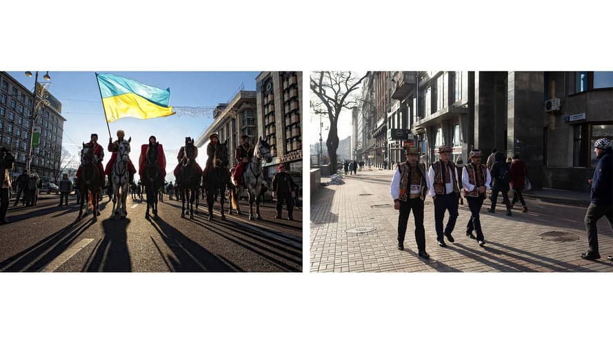 ЛІВОРУЧ: Вершники в козацькому одязі їдуть Хрещатиком у напрямку Європейської площі, Київ, 14 грудня 2013 року. Після багатогодинного протистояння майданівців із силовиками в ніч з 10 на 11 грудня й чергової спроби влади розігнати Євромайдан, кінні охоронці разом із іншими почали чатувати біля барикад й укріплень по периметру Майдану. ПРАВОРУЧ: Троє чоловіків у гуцульському вбранні прогулюються Хрещатиком, Київ, 18 листопада 2018 рокуЄвген Малолєтка/УНІАН; Анастасія Власова/Громадське